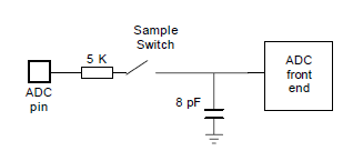 ADCの入力回路は、図のようにモデル化できます。直列の抵抗は5kΩ~10kΩ(図では5kΩとなっています)です。外部回路の設計の参考にしてください。